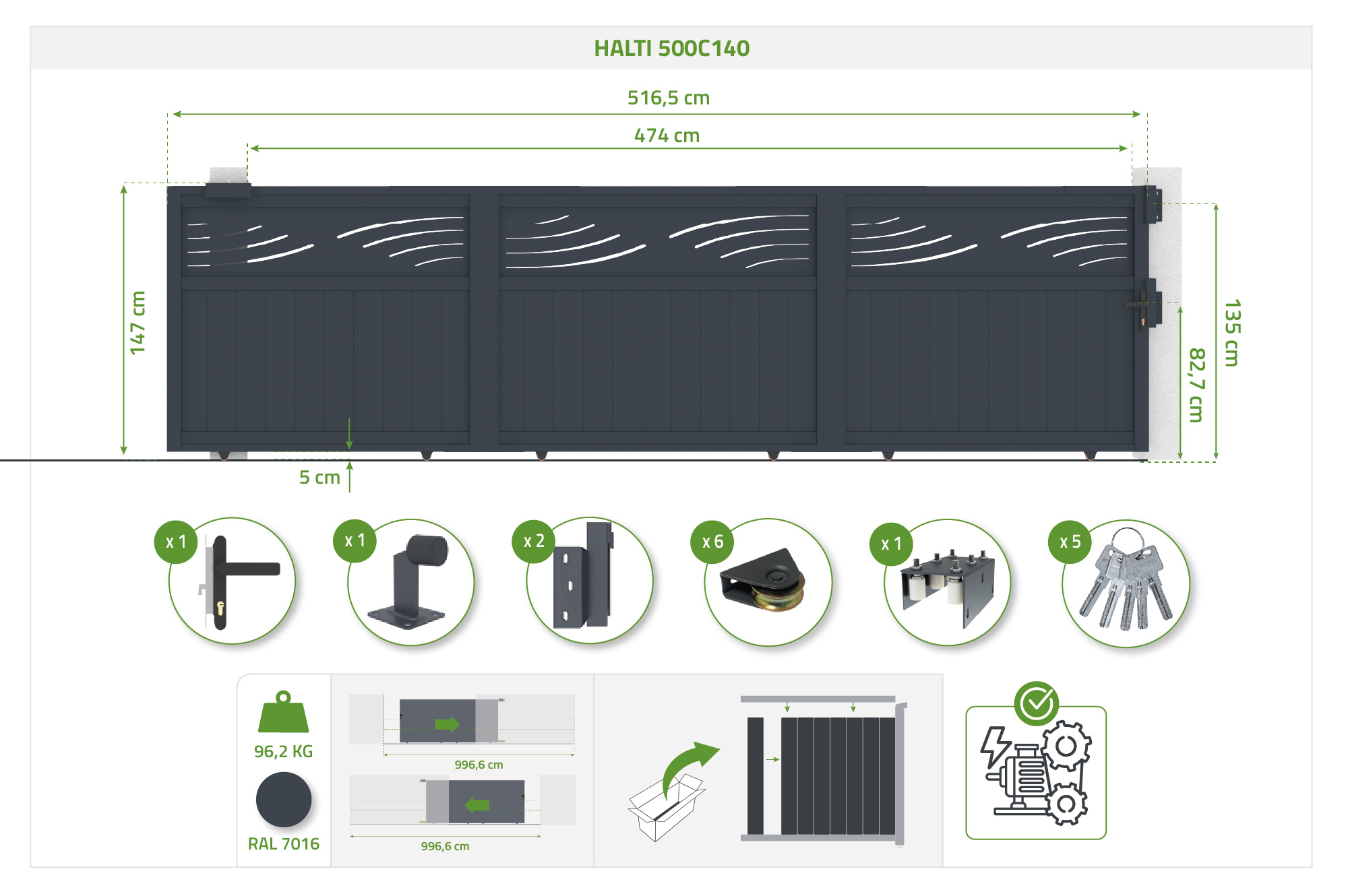 HALTI 5 m-es tolókapu, 140 cm magas, szürke alumínium