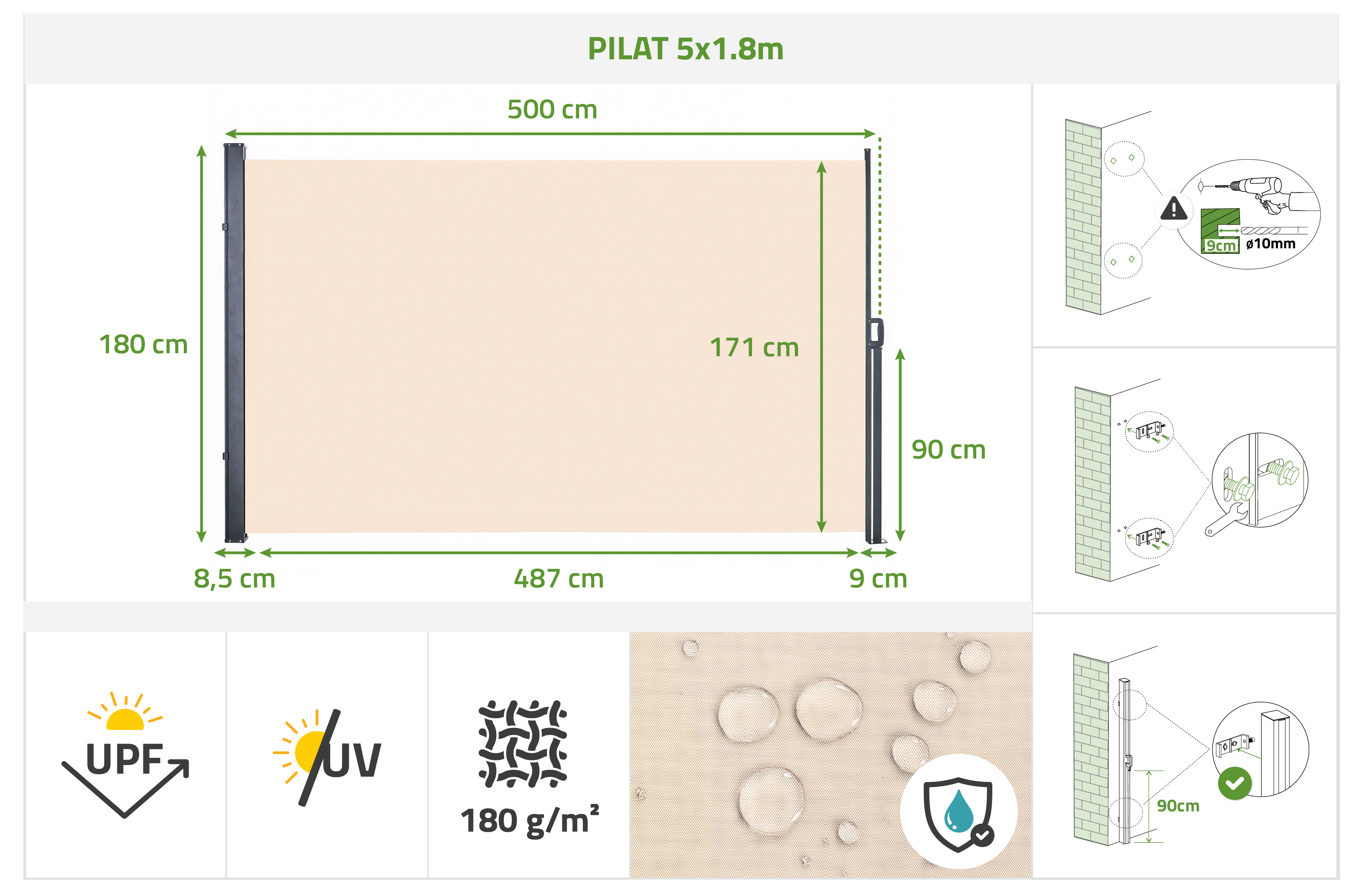 A PILAT termékcsalád ötvözi a minőséget, a robusztusságot és az eleganciát. Minden oldalsó napellenző 180 g-os poliészter szövettel rendelkezik, amely vízálló és UV-álló (SPF50+), így ideális a kültéri tér teljes élvezetéhez. A telepítés egyszerű, és a megfordítható rögzítés szükség szerint jobb vagy bal oldalra is állítható. A 2°-os szögben dőlő, 90 cm magas oszlop tökéletes szövetfeszességet biztosít, megakadályozza a megereszkedést, és gondtalan használatot kínál, még gyenge szélben is. A horganyzott és porszórt acél burkolat szilárdságot és tartósságot biztosít, míg a mellékelt vízálló takaró megvédi a napellenzőt behúzott állapotban. A PILAT termékcsaláddal teraszát vagy erkélyét meghitt, kényelmes és elegáns térré alakíthatja.